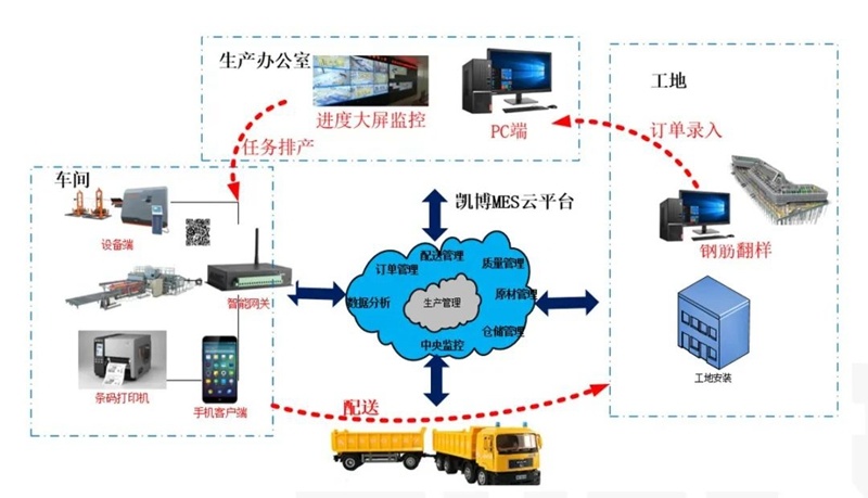 并且,凱博科技攜手中國鐵道科學(xué)研究院集團(tuán)有限公司,開發(fā)凱博鋼筋加工管理軟件系統(tǒng)和鋼筋加工遠(yuǎn)程控制系統(tǒng),打造智能控制中心。鋼筋加工管理軟件系統(tǒng)以鋼筋加工過程中物資流管理為核心,借助工業(yè)互聯(lián)網(wǎng)、云服務(wù)、智能設(shè)備等技術(shù)手段,實(shí)現(xiàn)多項(xiàng)目多任務(wù)遠(yuǎn)程訂單管理,實(shí)現(xiàn)訂單排產(chǎn)、生產(chǎn)訂單分發(fā)、生產(chǎn)標(biāo)牌打印、成品完成報(bào)工,成品出入庫等功能,同時能夠以電子大屏實(shí)現(xiàn)項(xiàng)目訂單動態(tài)實(shí)時監(jiān)控、加工廠整體運(yùn)營狀態(tài)的中心化顯示。鋼筋加工遠(yuǎn)程控制系統(tǒng),可實(shí)時顯示加工場各種設(shè)備生產(chǎn)狀態(tài),同時實(shí)現(xiàn)中控室對現(xiàn)場設(shè)備啟動和停止的遠(yuǎn)程控制,造就了高鐵梁場鋼筋加工數(shù)字化新模式!