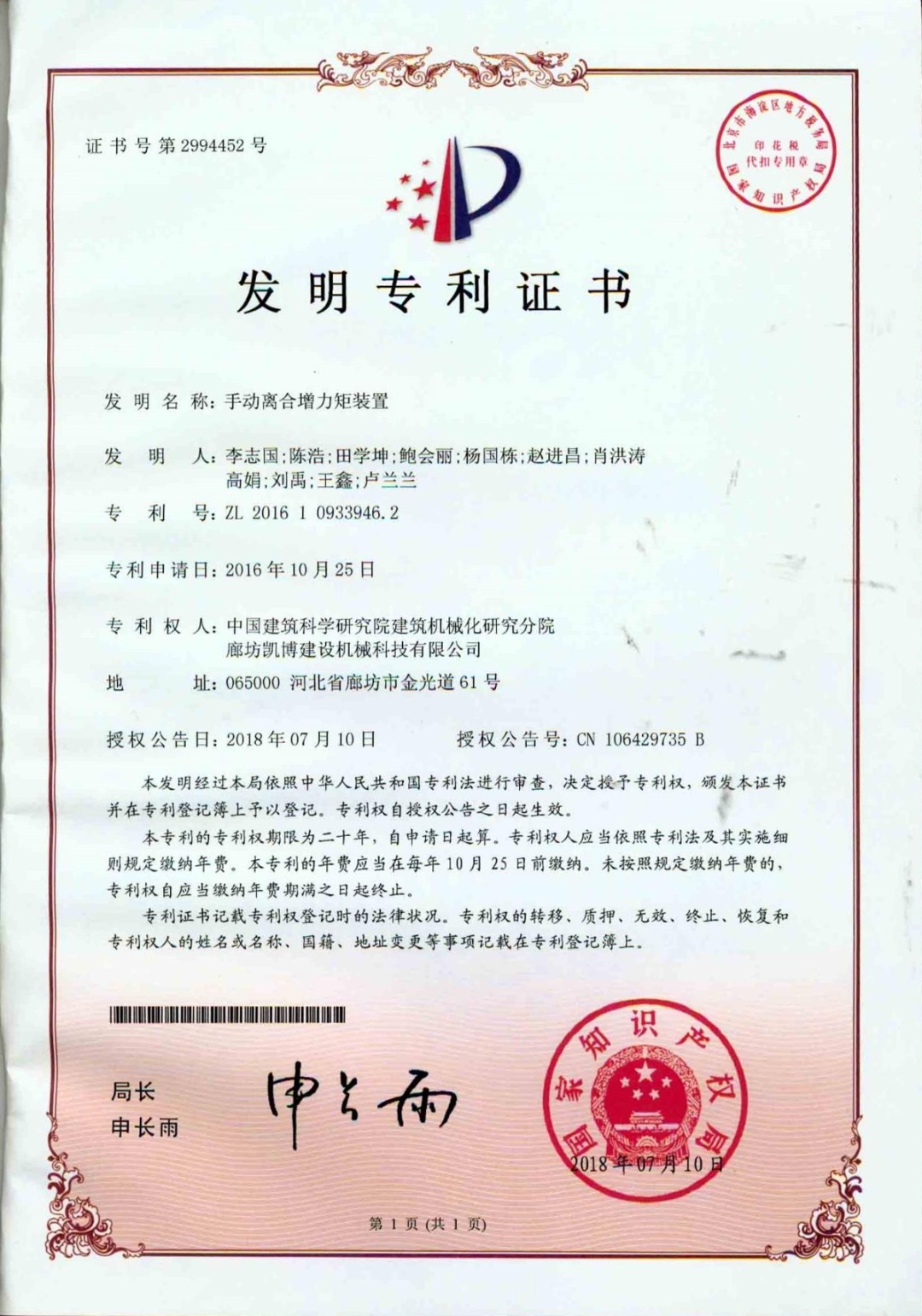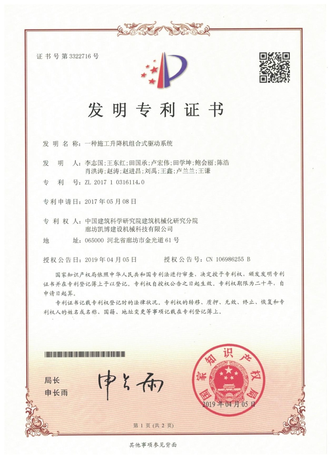 ? ? ? ? ? 本產品獲2項發明專利——施工升降機組合式驅動系統(專利編號:ZL201710316114.0)和手動離合增力矩裝置(專利編號:ZL201610933946.2);主編參編GB/T37537-2019《施工升降機安全監控系統》、GB/T 26557《吊籠有垂直導向的人貨兩用施工升降機》兩項國家標準;2021年榮獲“華夏建設科學技術獎”二等獎。為解決我國超高層建筑人員物料垂直運輸的高效安全平穩運行難題提供了強有力的技術支撐。